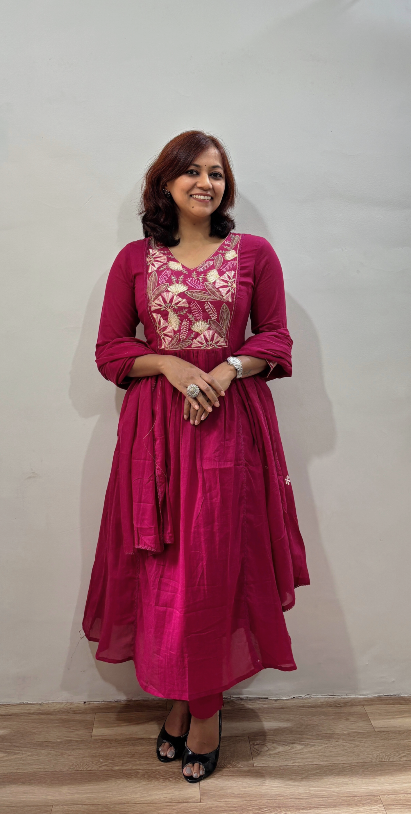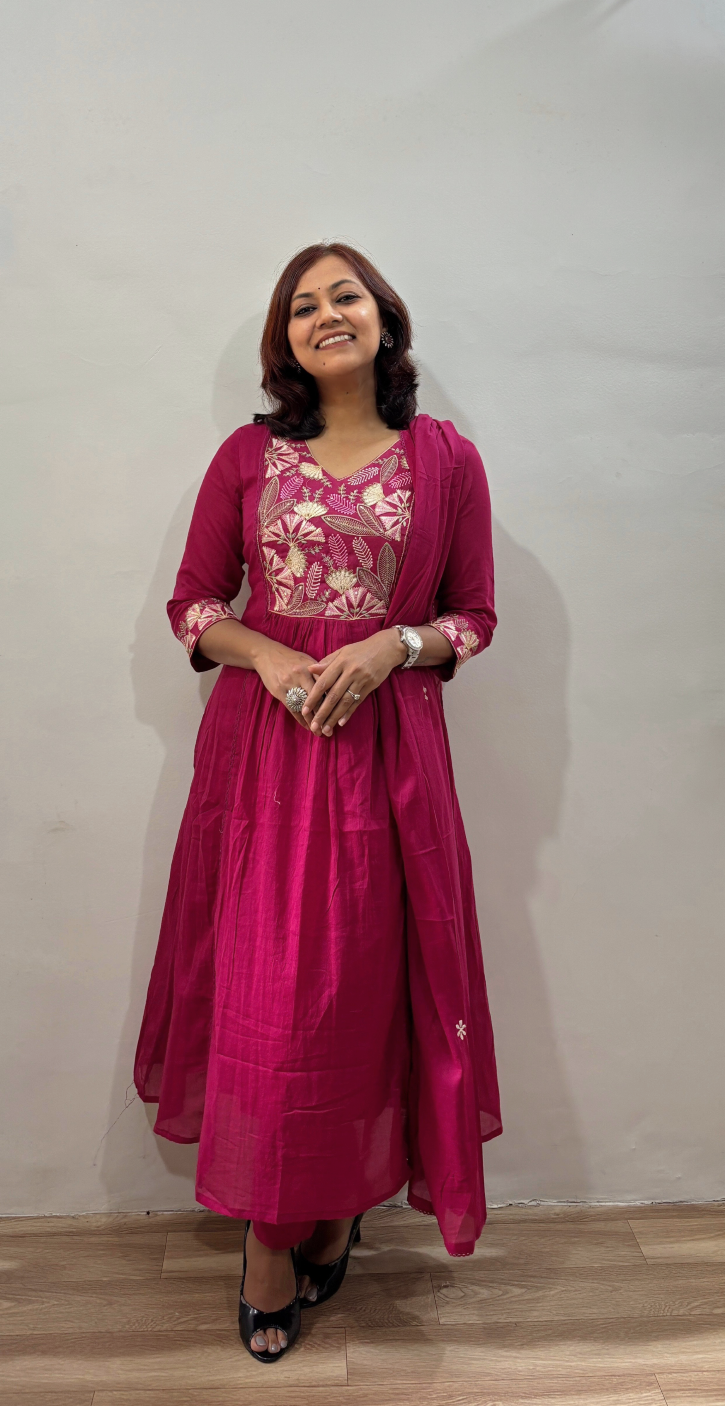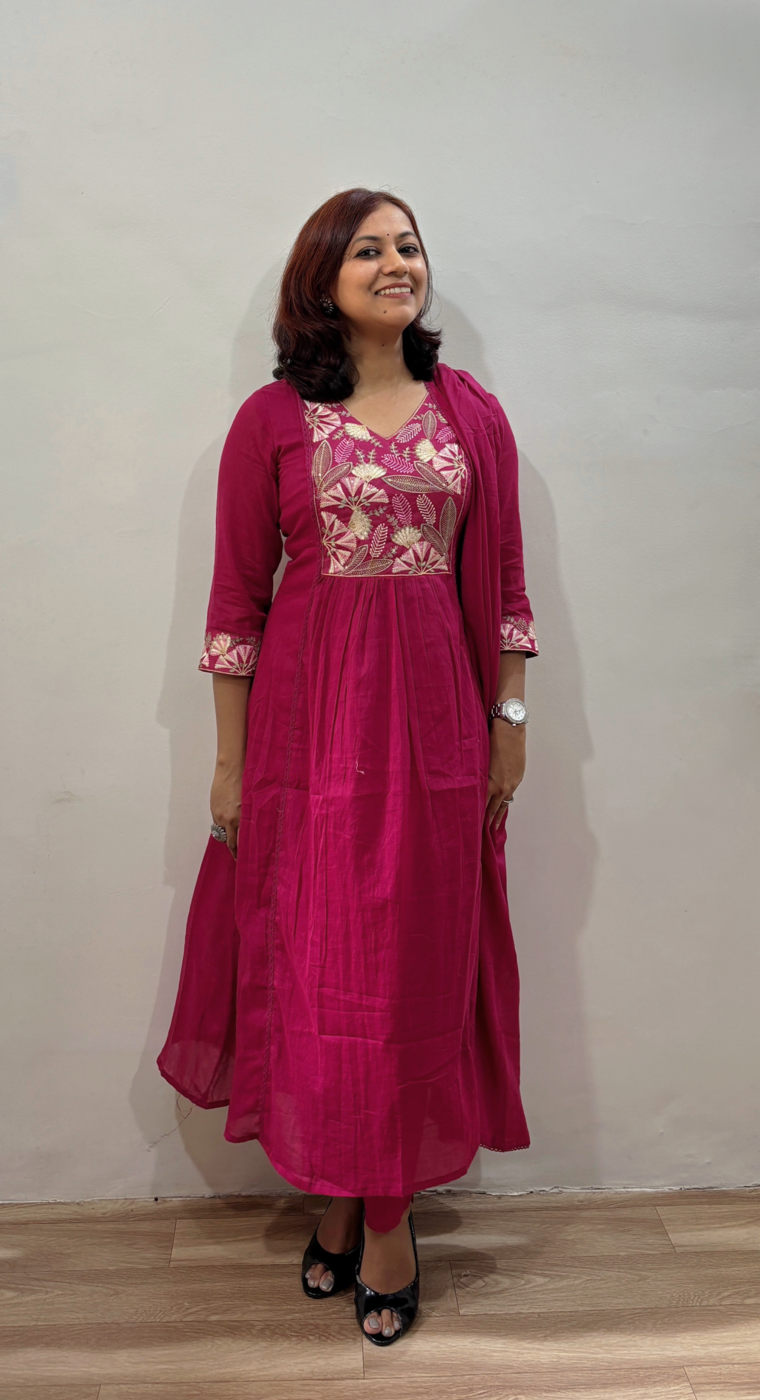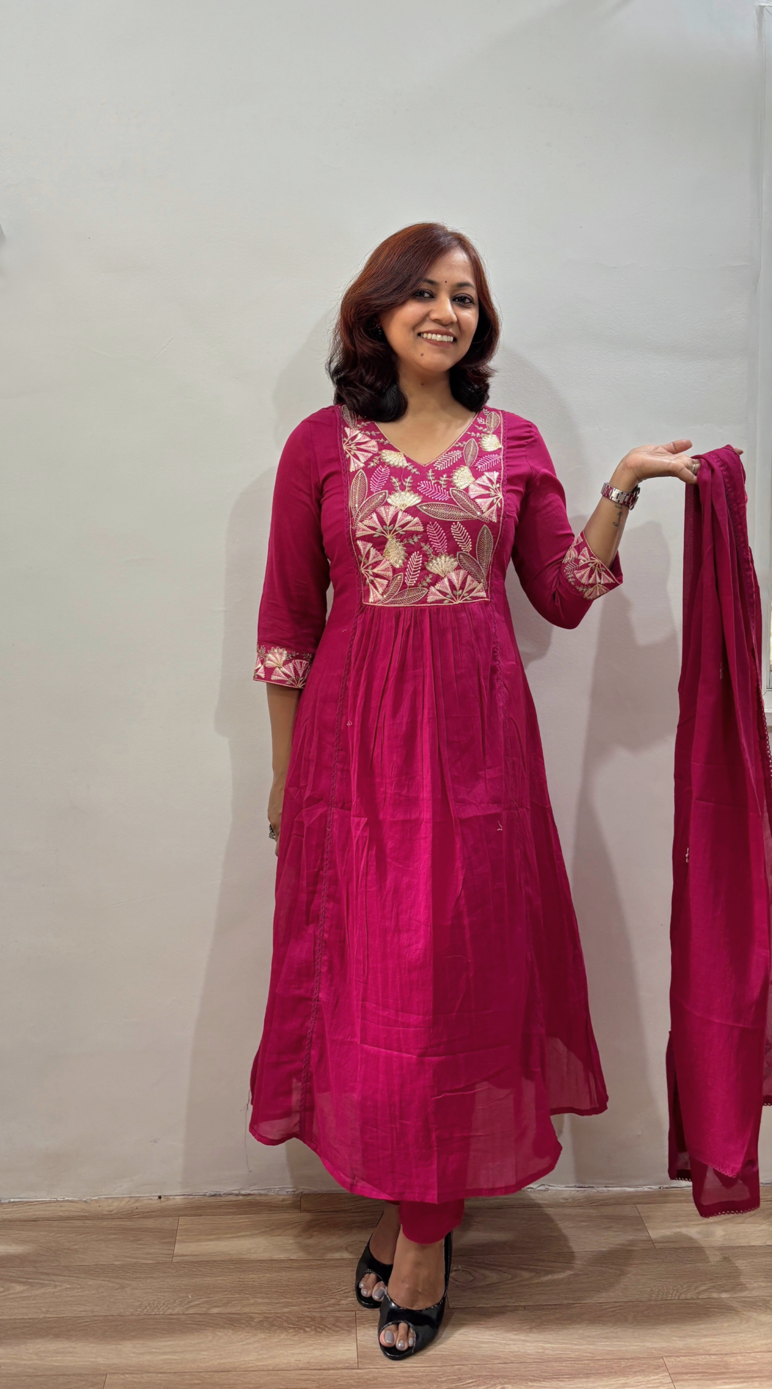 Work - kurta features exquisite floral and leaf motif thread embroidery with intricate bindi work on the front yoke and cuffs, adding a touch of festive charm.