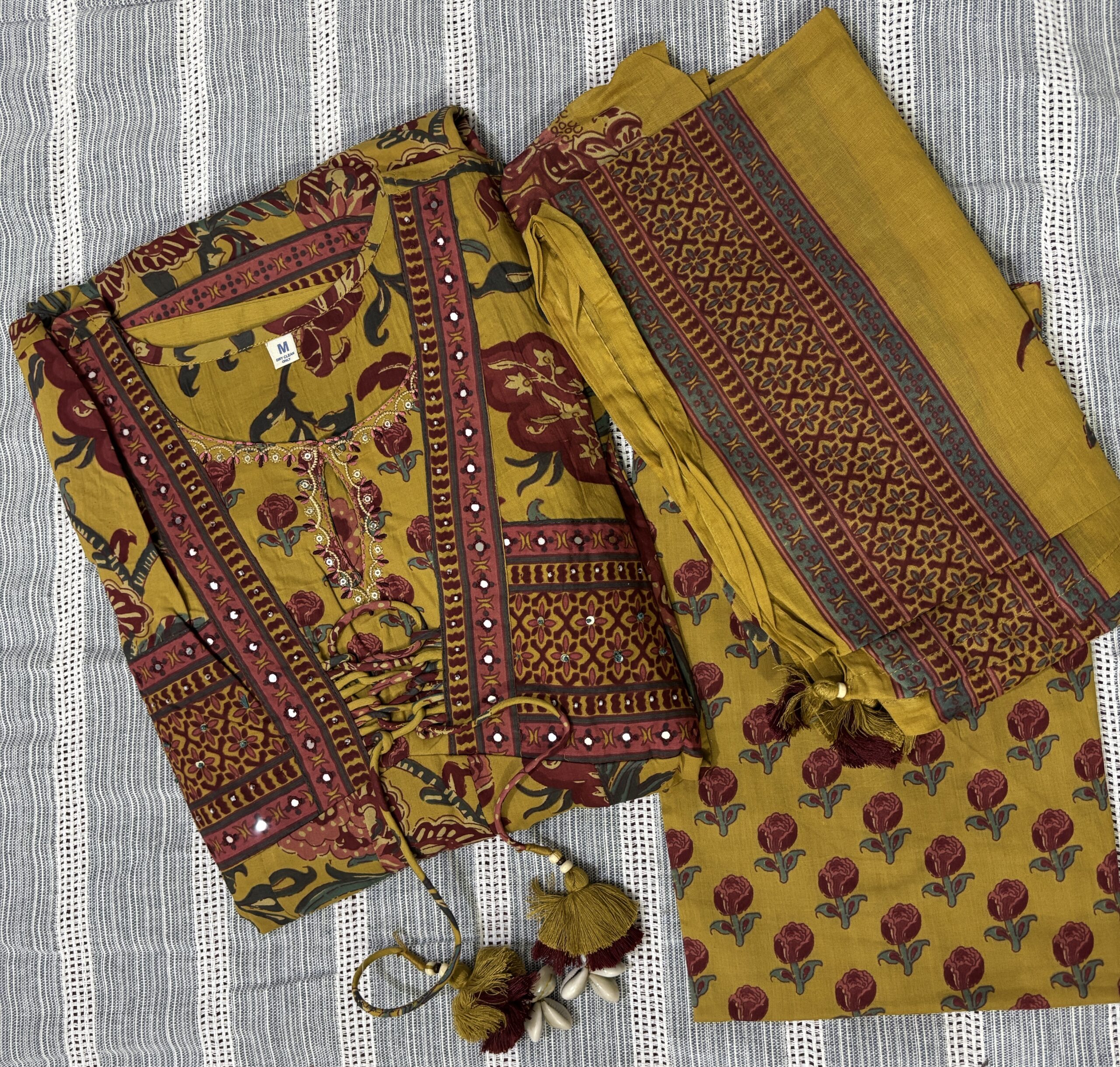 Pants come with semi elasticated waist and drawstrings. Dupatta comes with edging pre-done along with tasseled ends.
