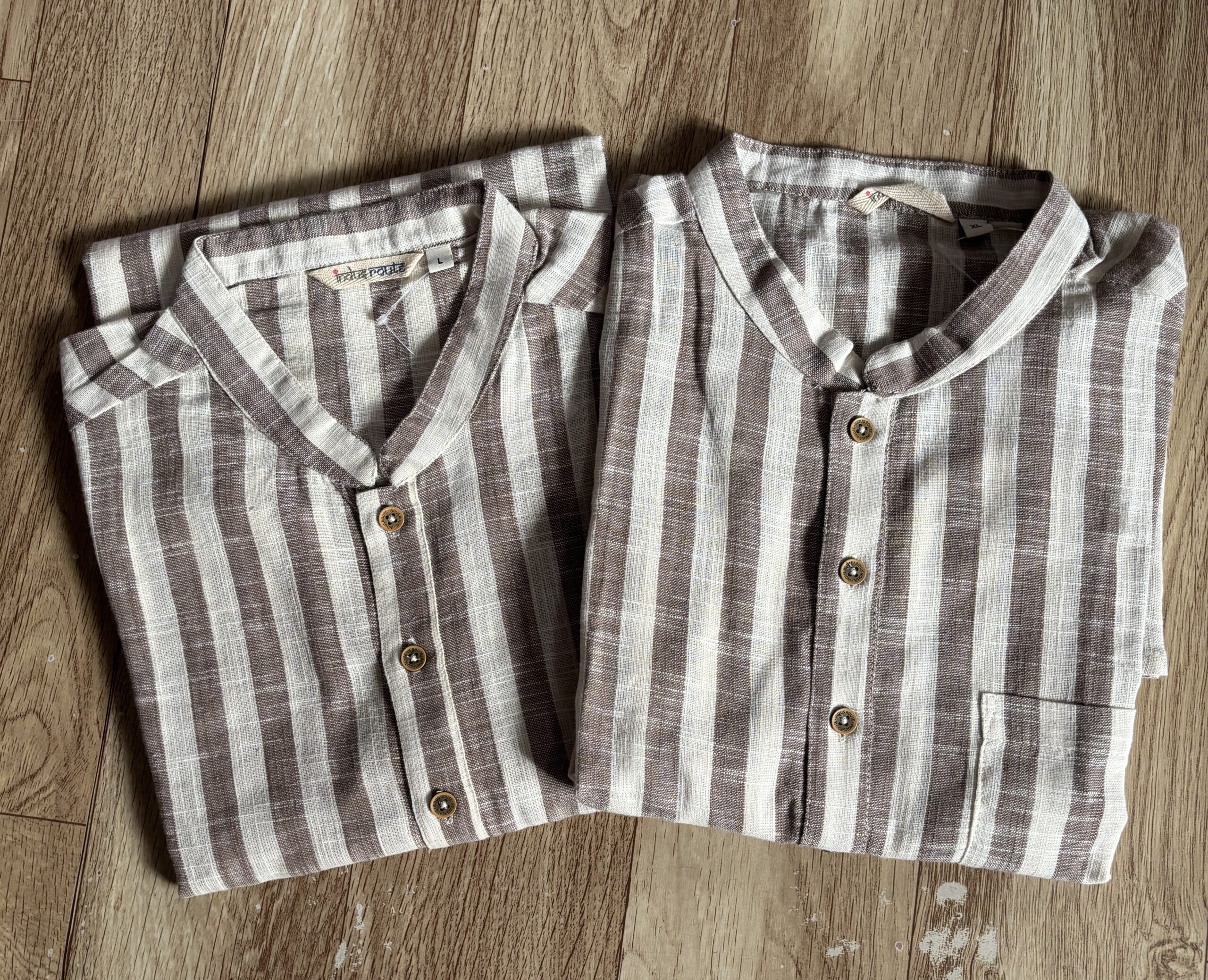 Length - short (shirt length), Fabric - Linen, Colour - Off white with brown vertical stripes, Neck - mandarin with a 4-button front placket, Sleeves - full sleeves with button up detail, Fit - regular, Pockets - yes, chest pocket