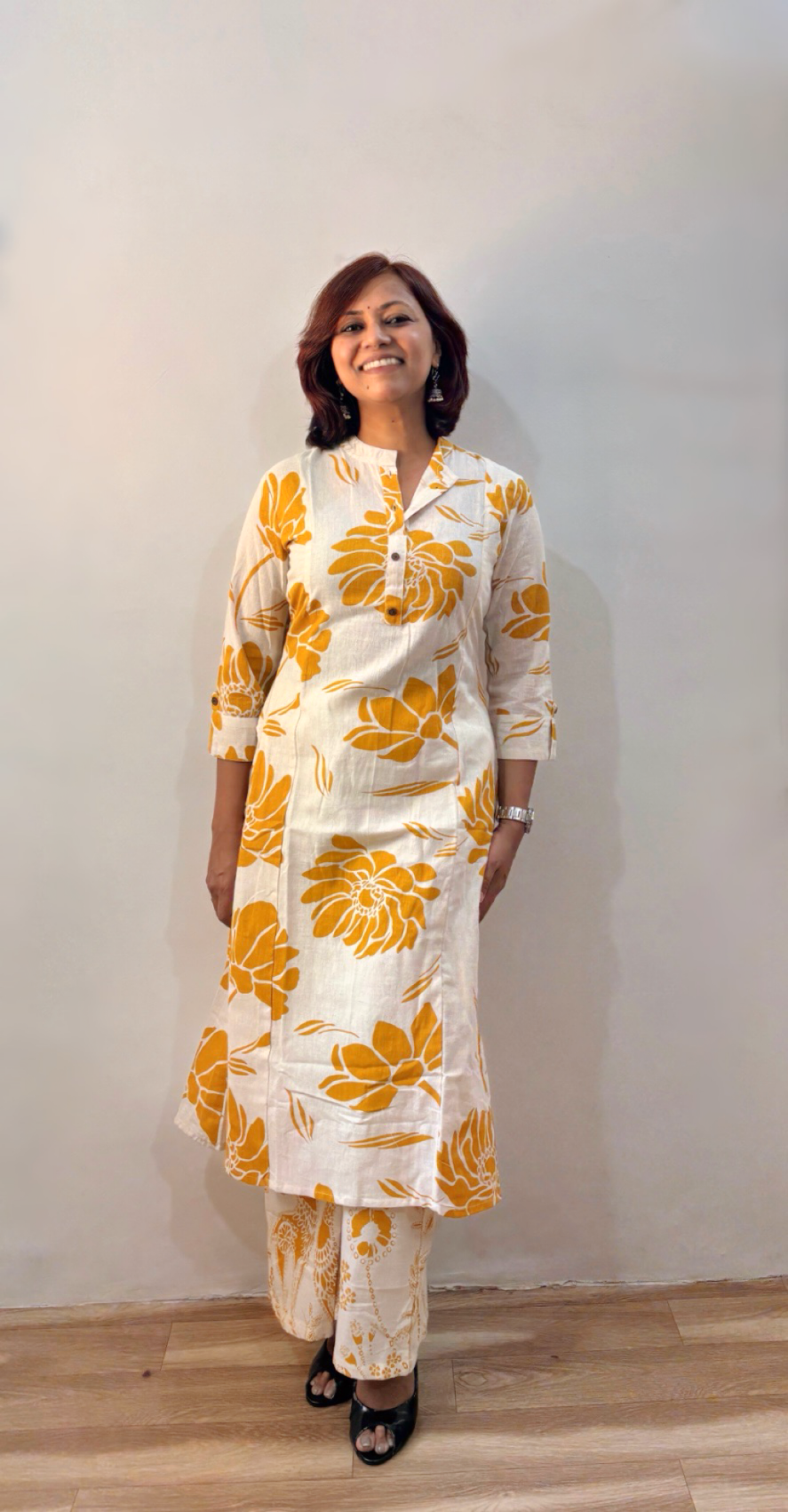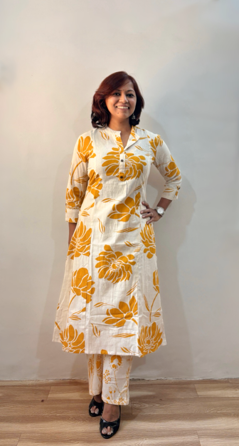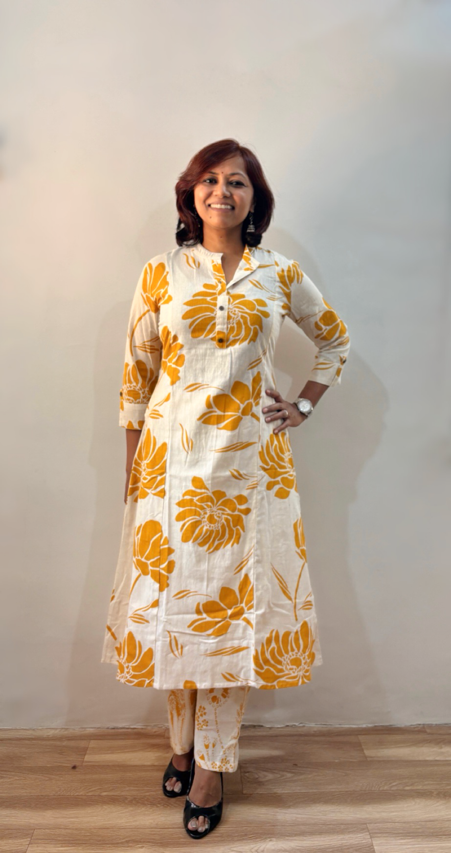 Colour - Off white with a bold floral print in mustard yellow giving the outfit a fresh and striking look.