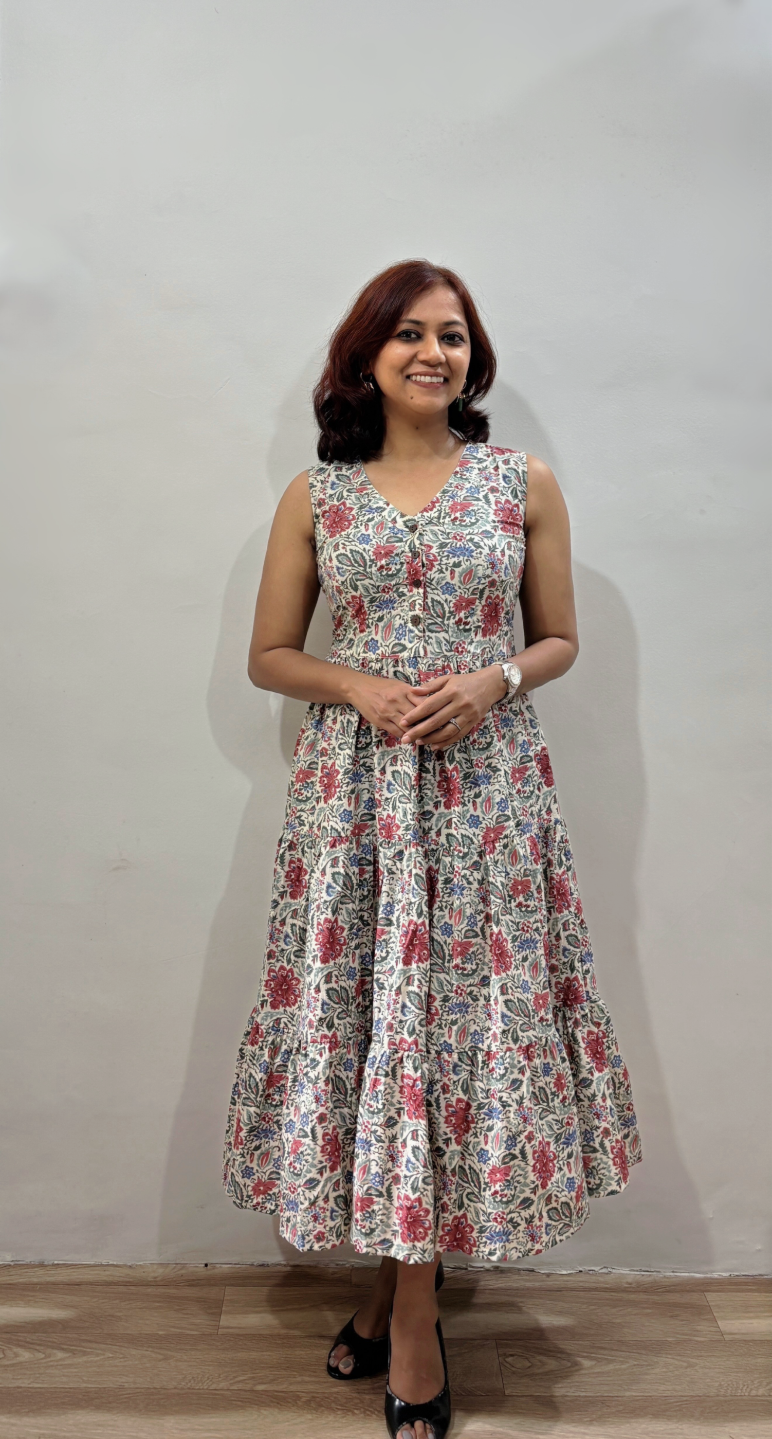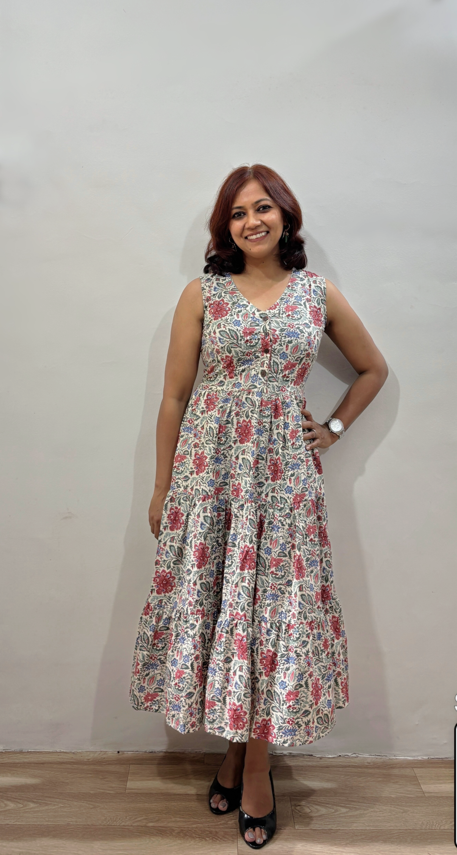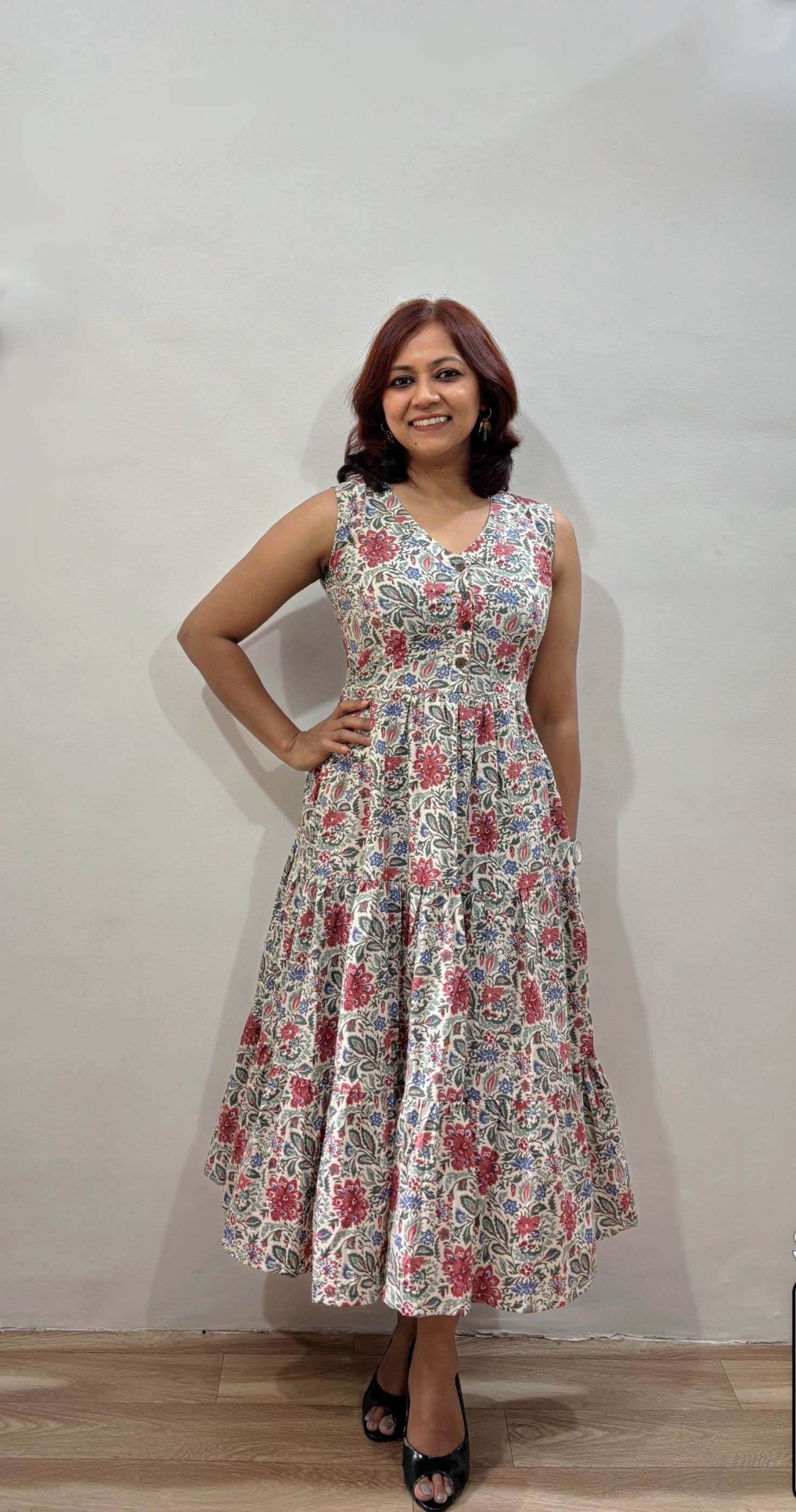 Style - Midi length tiered one piece dress with two side pockets.