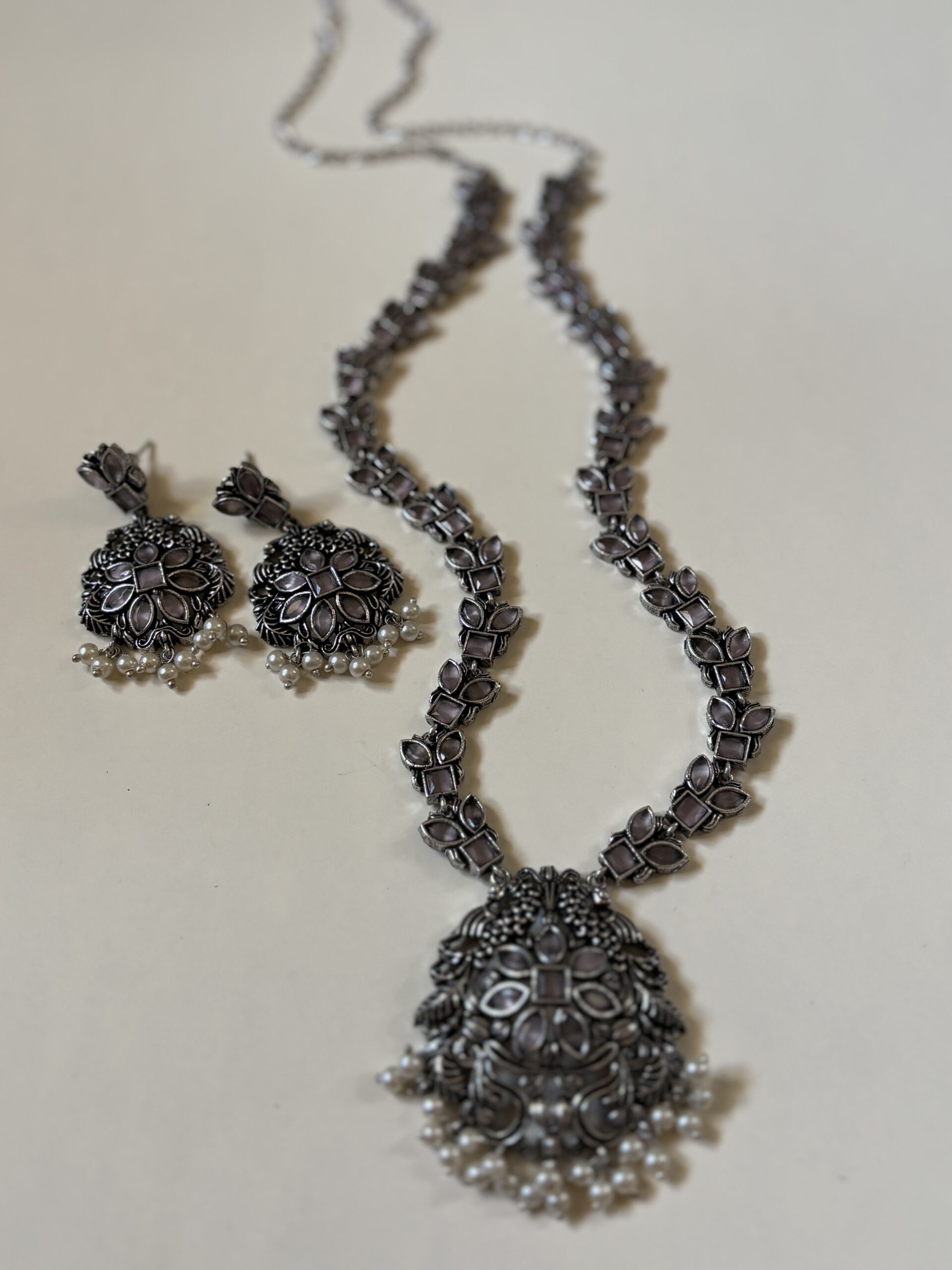 Oxidised Necklace-Earrings set with Pink stones