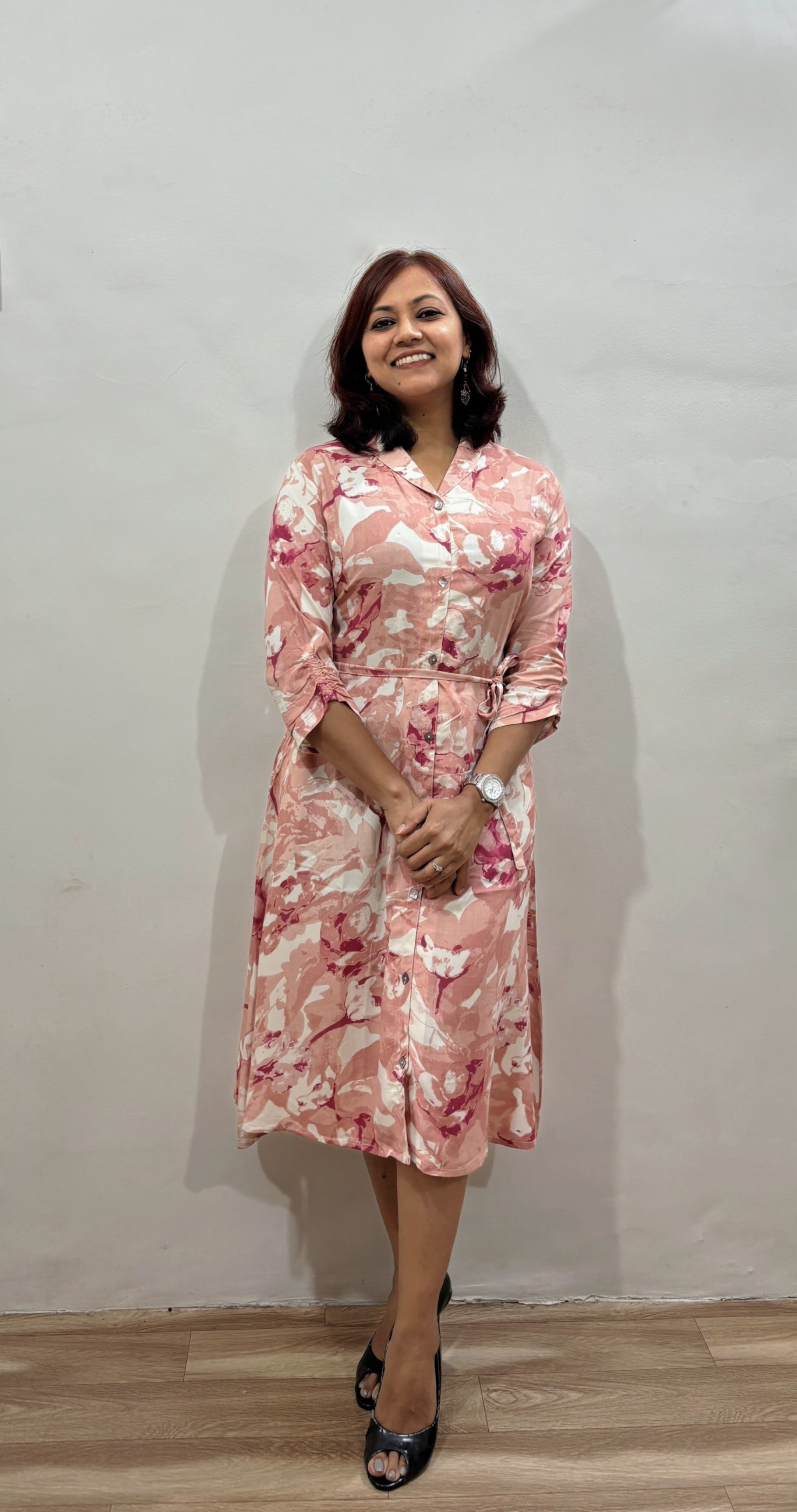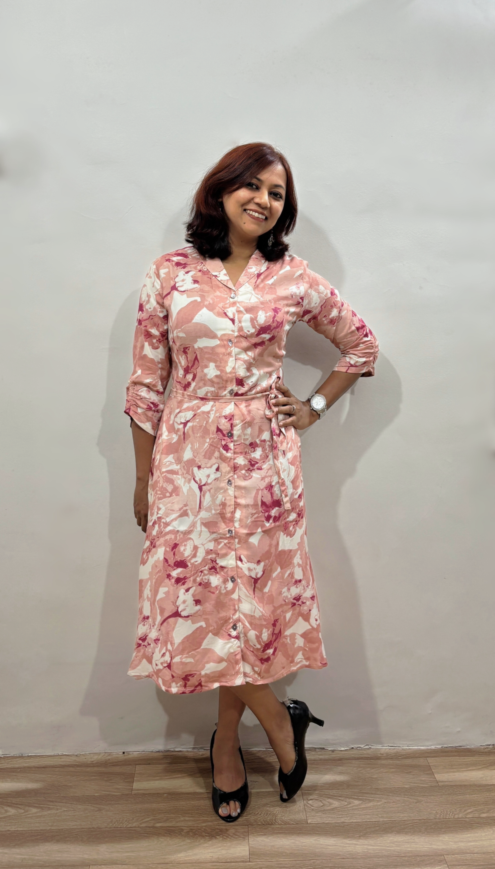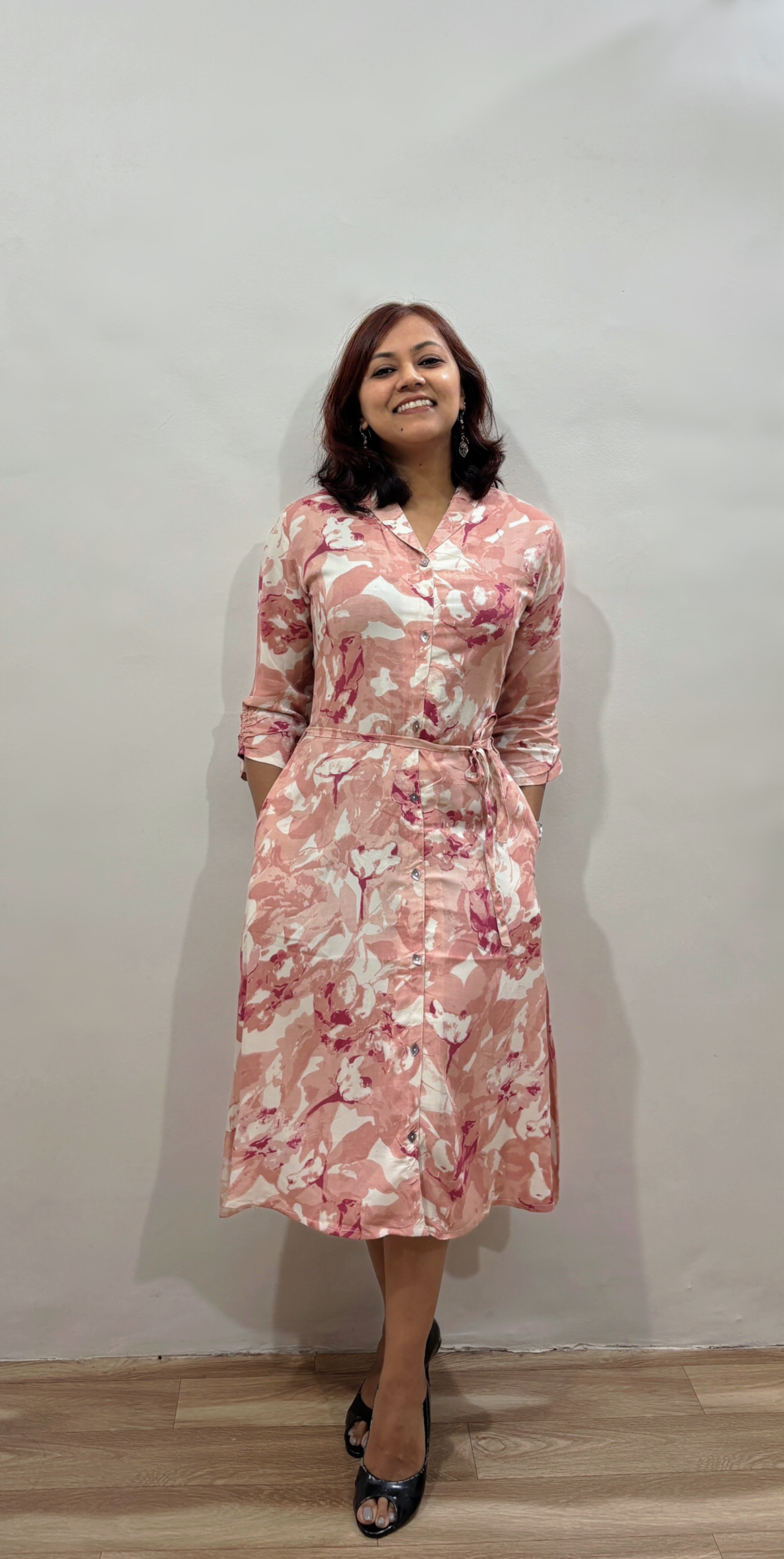 Style - Knee length one piece dress with a front slit, 2 side pockets and a fabric belt.